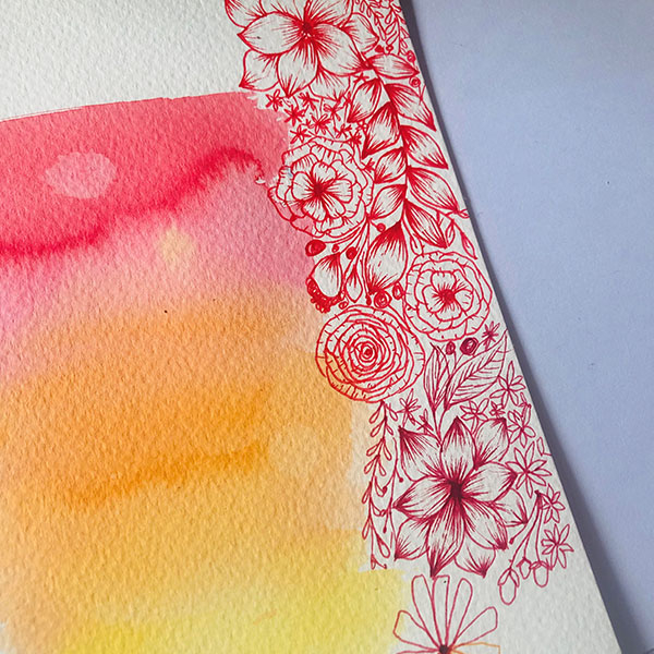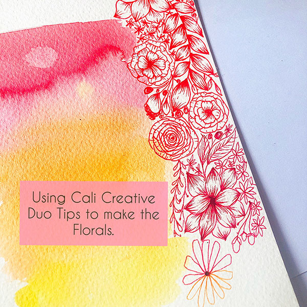 Time for the doodling! Take your Duotip Markers, using the Fine Tip start doodling some floral shapes, foliage and flourishes and create a border around the watercolour wash. Start with the colour that matches your first Aquabrush colours, working your way round to match the next colours as you reach your final shade. I start from dark to light so my doodle started with red, as I worked round I blended in an orange, finally finishing on yellow.